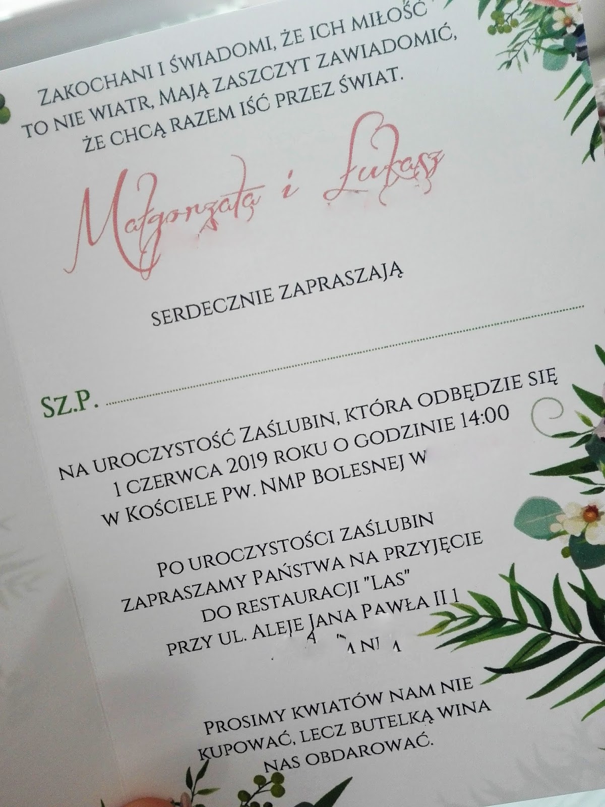 Wybrałam prostą klasyczną formę, bez udziwnień w stylu kokardek czy sznurków. Bardzo podoba mi się ich wzór, idealnie pasował do nas i do naszego wesela :) Tekst w środku wybierałam sama i też zależało mi, aby był jasny przekaz dla gości.